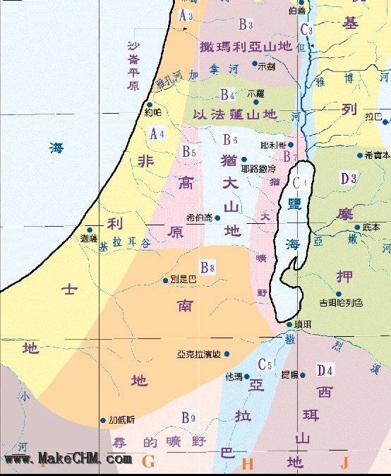 在地中海(Mediterranean Sea)和盐海(死海 Dead Sea)之间的地区,从西向东依序为“沿海地带”、“高原”、“犹大山地”和“犹大旷野”。
