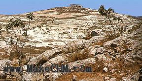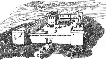 “有一日,扫罗的儿子约拿单(Jonathan)对拿他兵器的少年人说:‘我们不如过到那边,到非利士人的防营那里去。’但他没有告诉父亲。扫罗在基比亚(Gibeah)的尽边,坐在米矶仑(Migron)的石榴树下,跟随他的约有六百人。”-- 我们不知道两军对峙有多久。基比亚(现在的 Tell el-Ful)是扫罗的家乡,也是他的大本营。考古学家在这里的发掘显示,在这地建立的四个堡垒中,第二个显然是扫罗建造的。这个两层建筑物大致呈正方形,面积为五十五尺乘五十一尺,墙壁有八尺至十尺厚。在地窟中,还发现用作储藏的瓶,周围有很多家用的陶器和其它工具。虽然这里只有两亩的面积,却是以色列第一个重要的政治中心(看下图):