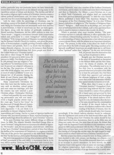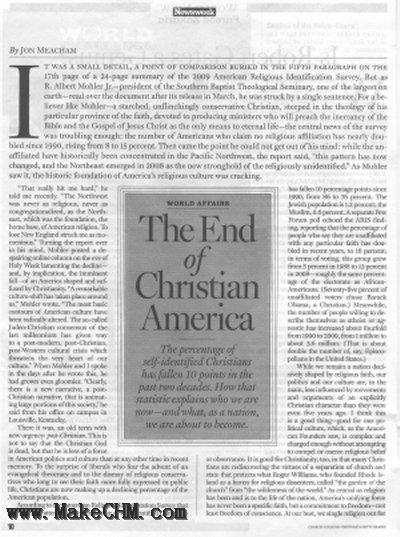 如果上帝要赐给奥巴马总统智慧聪明,我想上帝也要在夜间梦中“偷偷地”赐给他,不能让奥巴马在公开场合向他祷告祈求。因为奥巴马这样做,除了得到一些传统的福音派人士的赞赏之外,必定引发轩然大波,遭到广大民众的冷嘲热讽。怎么说呢?首先,根据最新的社会调查,美国人口的宗教信仰已经很淡化。《新闻周刊》(Newsweek,2009年四月20日)刊登封面报道,标题是《基督教美国的衰亡》(The decline of Christian America):(也请大家参考作者临风一文《关于美国宗教衰退的警钟》,2009-05-06)
