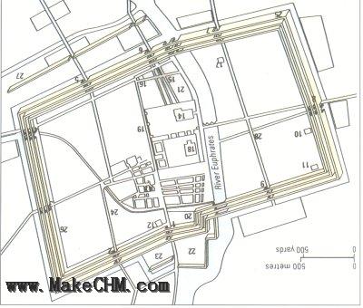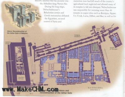 (略成方形,每边长22.2公里,围绕城市的城墙约高8.5公尺;四匹马拉的战车可以在宽阔的城墙上奔驰,全城有100扇用铜做成的城门,最有名的是伊施他尔门 Ishtar Gate)点击放大 800X