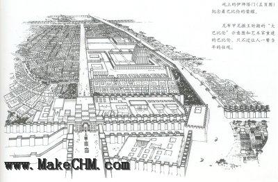 古巴伦遗址,证明这都城市宏伟壮丽的。图的中央看见伊施他尔门(Ishtar Gate)的遗迹,有珐琅质的砖墙饰上了狮子及其他动物(在德国赞助下,挖掘于1899年开始) 尼布甲尼撒宫殿(Palace)(左上图是重建的伊施他尔门Ishtar Gate)