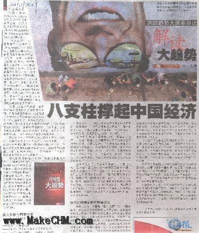 二、国际趋势大师约翰·奈思比(John Naisbitt)和桃乐丝·奈思比(Doris Naisbitt)今年出了一本《中国大趋势 -- 八大支柱撑起经济强权》(China's Megatrends : The 8 pillars of a A New Society,HarperCollins Publishers NY;中文译本的出版社是台湾天下文化,2009年10月)。他预言中国将在今后数十年复制它在奥运上的成功,和在经济与竞争力上的表现,成为经济强权。他认为有“八大支柱”撑起中国的经济: