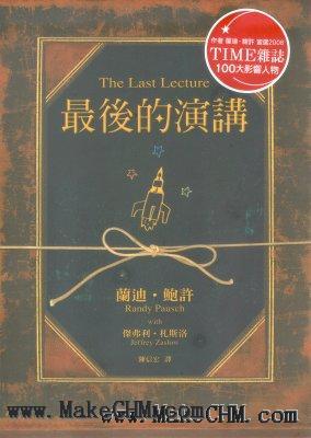 也许我们可以从兰迪·鲍许(Randy Pausch)学到一点功课。兰迪·鲍许是一位热情、风趣且教学认真的大学教授,在46岁时被诊断出罹患致死率最高的癌症 - 胰脏癌。隔年(2007年)8月,医生说他的癌症已经转移,可能只剩下三到六个月生命。9月,兰迪教授应学校之邀发表了一场“最后的演说”(The Last Lecture)。这场演说让现场四百个人笑声不断,也让不少人留下泪来。据美国《纽约时报》报导,至少已有一千万人上网观看这场演讲的内容。(网站:http://www.thelastlecture.com/)之后,兰迪教授和《华尔街日报》专栏作家杰弗利·札斯洛(Jeffrey Zaslow)联手写成一本精彩丰富又让人动容的 - 《最后的演讲》。(看下图书的封面)