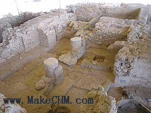 至于大衮庙,考古学家挖掘的结果发现了两处遗址,一在现在特拉维夫(Tel Aviv)北部的 Tel Qasile,另一在特拉维夫以南 21英里的 Tel Miqne,就是非利士五个城镇之一的以革伦(Ekron),在亚实突的东面 18公里。两间庙都有独特的设计,屋顶由两根粗大的木制柱子支撑,相距约六尺(请看下图)。在 Tel Qasile 的庙,面积只有 6 X 7米,跟士十六:27 说的“房的平顶上约有三千男女”的大衮庙相差太远,所以我们不敢肯定这是属于当时的,还是后期的设计。