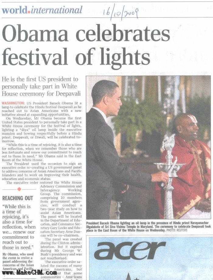 A。奥巴马总统在白宫庆祝印度教的屠妖节点灯仪式: