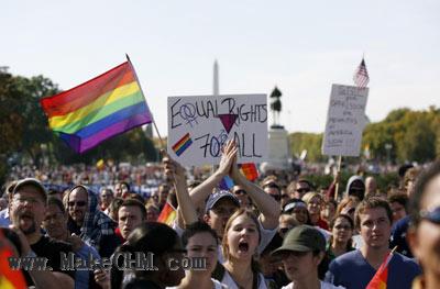 10月11日,华盛顿数万同性恋支持者参加游行中国日报网环球在线消息:据法国等媒体报道,2009年10月11日,华盛顿数万同性恋支持者参加游行,呼吁保护同性恋者权益。此前一天,奥巴马总统称要废除军中同性恋禁令。