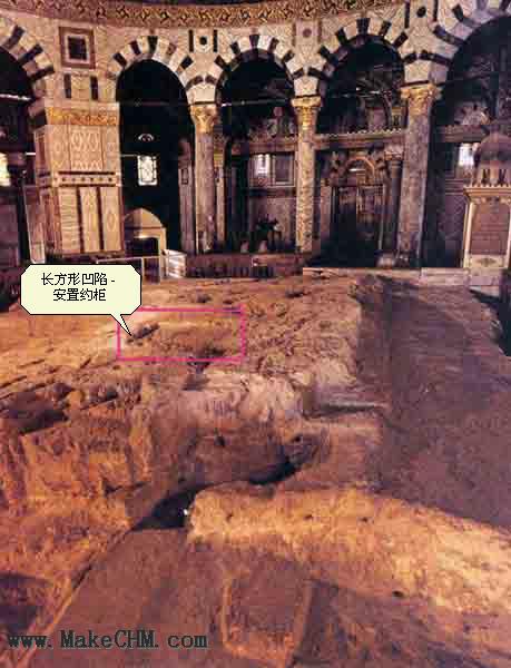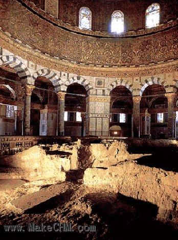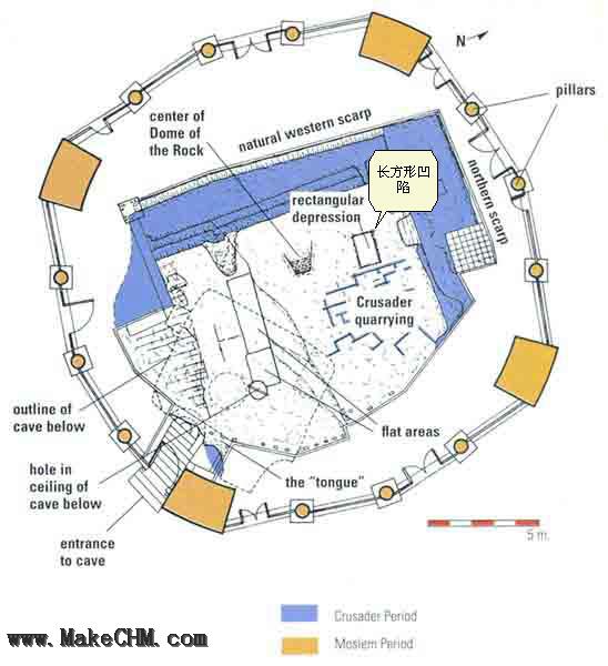 二、Dr Leen Ritmeyer,一个建筑制图员,曾参与考古学家 Prof Benjamin Mazar 圣殿山的挖掘工程,认为至圣所(Holy of Holies)的位置就是现在圆顶清真寺(Dome of the Rock)内 the Rock (亚拉伯文 es-Sakhra)的所在地,刚好在金顶(golden dome)之下。(以下的图片取自他在《圣经考古评论》的两篇文章:BAR 22:01, Jan/Feb 1996,BAR 18:02, Mar/Apr 1992)