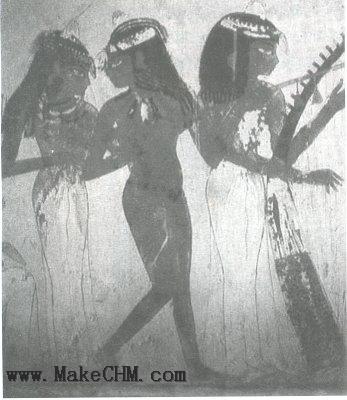 其实,主前一千年的大卫王时代有乐师和乐器一点也不足怪。上古音乐史的研究显示,早在古代埃及第四王朝(约公元前25世纪)的墓壁上就有演奏竖琴的画面。中王国时期(约公元前22-16世纪)出现了所谓“竖琴手之歌”,竖琴手是当时节日庆祝活动的座上客,他们不仅通过音乐为主人和客人增加节日的欢乐气氛,而且还经常在歌词里讲述人生的哲理。十九王朝出土于纳赫特墓的壁画上的三个女乐师(主前1425年)演奏了三种乐器:竖琴、长颈琉特琴和笛(看图三)。很显然,这些都是当时就已经存在的乐器以及当时的音乐生活的局部面貌。图四是一件出自希腊克里特岛,新石器时代(约四、五千年前)的弹竖琴大理石雕像。