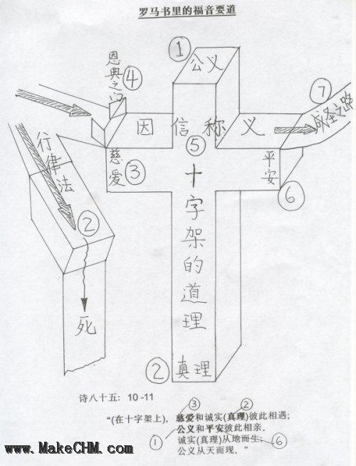 11诚实从地而生;公义从天而现。我在《罗马书》课程里就曾用下图来解释十字架上的救恩:公义和慈爱在十字架上彼此相遇,这是上帝的智慧安排,不是人可以想出来的。