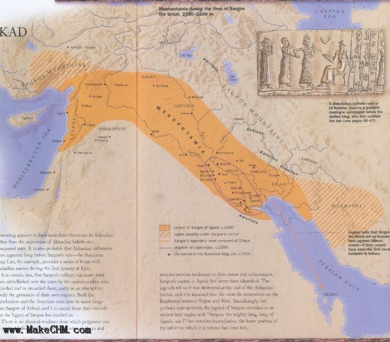 不久,苏默人开始面对从示拿平原以北闪族居民亚喀得人(Akkadian)的挑战。他们的领袖撒珥根(Sargon,2335-2279BC)出身低微,可能是一个私生子,像摩西一样,在婴孩时被放置在一个芦苇的箱内,在幼发拉底河漂流。根据苏默的传说,他是被“灌溉者” 艾加(Akki the irrigator)拯救及养育的。撒珥根小心组织自己的势力,统一了苏默王朝的十二个城邦(city-states),建立亚加德城(Agade),帝国包括了北部的亚喀得(Akkad)和南部的苏默(Sumer),再从东方的以拦(Elam)扩展至叙利亚和地中海。(图五,六)
