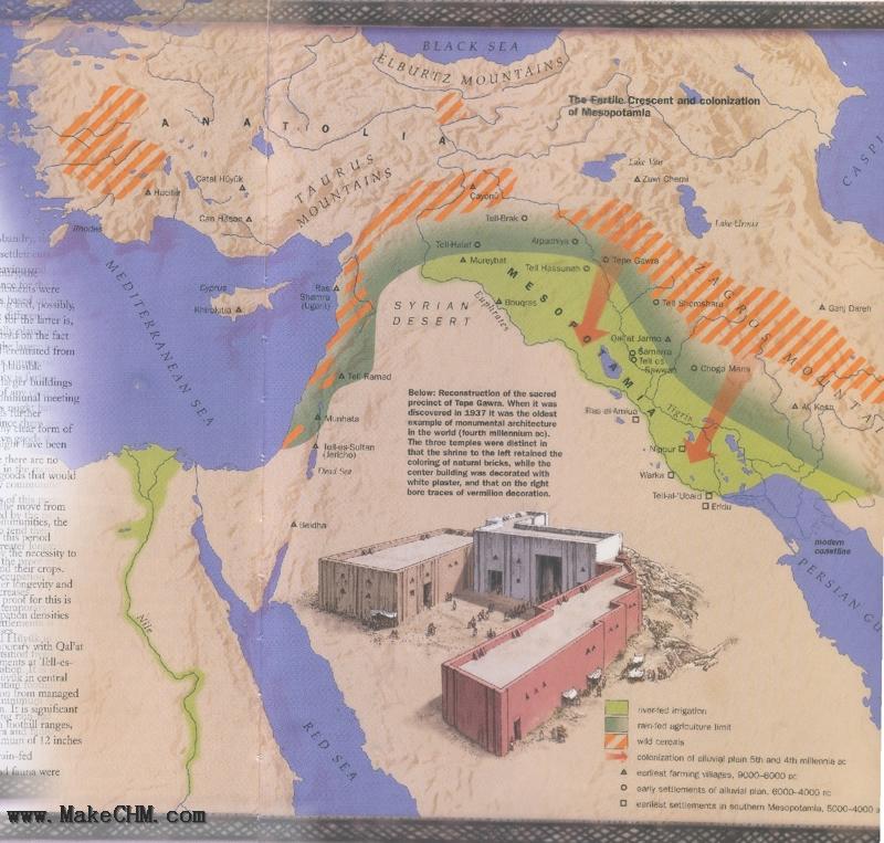 在吾珥(Ur)西北四哩的一个名叫艾乌比(Al Ubaid)的小丘中,出现了两河流域最划分明白的黄铜时代的文化。这文化显示它是属于从扎格罗斯山脉(Zagros Mountains)向南进入幼发拉底三角洲最早的居民。(看图一)他们的进入是由于从巴比伦平原流下来的大量冲击泥改变了波斯湾海岸线的形状,使艾乌比等接近海岸的地方,现在变得较为远离海岸;下米所波大米成为肥沃文化的平原,吸引了一系列的文化输入这地区,形成近东历史文化的基础。