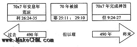 (1) 但以理一直盘算着“七十”年被掳的期限,他的注意力集中在“年”上。 D.K. Campbell 谓但以理视以色列七十年被掳期是选民因荒弃了没有遵守七十个安息年而导致的(参耶 25:11, 12 ; 24:10 ;代下 36:21 ;利 26:33-35 )。换言之,选民国在过去 490 年内没有遵守安息年,现今但以理看见在前面亦有 490 年之久神便会在选民国身上完成他的计划,参图析如下:(注 29 )