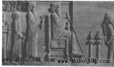 坐着的是大利乌一世(主前五二一至四八六年),站在他后面的是 已加冕的薛西王子;他们从波斯立的困境中被解救出来。 |