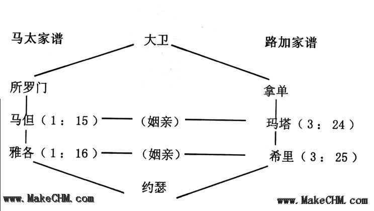 ( 2)马太的家谱是从约瑟方面追溯耶稣的先祖,藉此建立他是王的后代,以证明他是合法非妄称的王(legal descent),这是马太福音读者所关注的问题;F.W.Beare 谓犹太人认为母亲永不能将坐宝座之权柄传给她后人,不管她是否大卫的血裔(注13),故马太的家谱必是约瑟的,由他才能将为王之权传给后代;而路加的家谱却从马利亚方面着手,追溯耶稣的先祖(real descent),藉此建立他又为人的世系,这是路加读者所关注的。此释论获不少学者接受(如Luther, Lightfoot, Bengal,Lange, Robinson, Alexander, Godet等)。