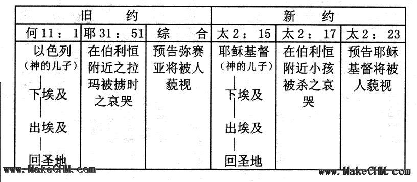 ( 4)类表法 据此法,何11:1记的只是一段以色列人下埃及与出埃及的历史,而现今耶稣的情形与古时的以色列一样,故这是个同类别的处境,而两者皆称为“神的儿子”,马太遂呼之为应验,因“应验”(pleroo)这字有甚广之意义,可指“直接应验”(如太1:22-23),亦可指“应用应验”(applicational fulfillment)(如各2:23)(注38)。M.C. Tenney 称此用途为“预言的平行论”(相对论)(prophecy by parallelism)(注39);T.L. Howard 呼之为“类同相对论”(analogical correspondence)(注40),故马太视此事只是历史的“相似”(correspondence)。犹太学学者B.J. Roberts 谓此法在拉比文献中亦常见, 称pesher法(注41)。