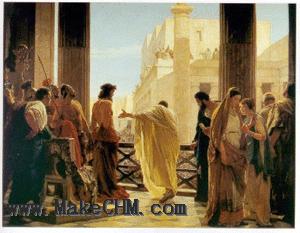 他來到耶路撒冷是逾越節的時候為的是維持秩序。耶穌使這一位鐵石心腸的羅馬巡撫深受感動可算是歷史上一幅頂奇妙的圖畫,我們不知道耶穌是否如同一種傳說所稱衪直立不屈,體格魁梧,抑或如同另一種傳說所稱衪屈腰垂肩,面容難看,但衪的面貌和態度必然顯出極具神性,極有威嚴,以致衪雖然穿著有諷剌性的袍子,頭上戴著荊棘冠冕,臉上有血流下來,然而彼拉多不能不對衪注目而視。