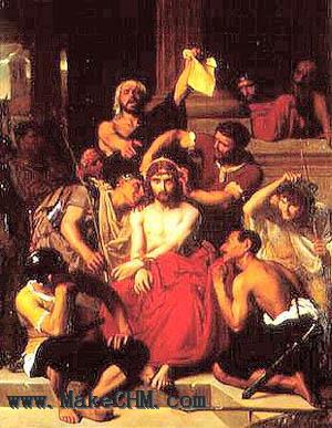 27巡撫的兵就把耶穌帶進衙門,叫全營的兵都聚集在他那裏。 28他們給他脫了衣服,穿上一件朱紅色袍子。 29用荊棘編作冠冕,戴在他頭上,拿一根葦子放在他右手裏。跪在他面前,戲弄他說,恭喜猶太人的王阿。 30又在唾沫在他臉上,拿葦子打他的頭。 31戲弄完了,就給他脫了袍子,仍穿上他自己的衣服,帶他出去,要釘十字架。 猶太人在審問的時候,戲弄過衪(路廿二:63-65);希律和他的兵丁都戲弄衪(路廿三:11);現在彼拉多的兵丁戲弄衪。並且不久之後,掛在十字架上,那些祭司長,長老,文士和兵丁都戲衪(廿七:39-43);他們殘暴的行為引以為樂事,令到一位自稱為神的兒子的人要屈服於這種羞辱和痛苦。