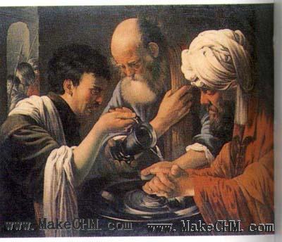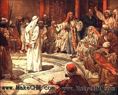 28 眾人將耶穌、從該亞法那裡往衙門內解去。那時天還早。他們自己卻不進衙門、恐怕染了污穢、不能喫逾越節的筵席。 29 彼拉多就出來、到他們那裡、說、你們告這人是為甚麼事呢。 30 他們回答說、這人若不是作惡的、我們就不把他交給你。 31 彼拉多說、你們自己帶他去、按著你們的律法審問他罷。猶太人說、我們沒有殺人的權柄。 32 這要應驗耶穌所說、自己將要怎樣死的話了。 33 彼拉多又進了衙門、叫耶穌來、對他說、你是猶太人的王麼。 34 耶穌回答說、這話是你自己說的、還是別人論我對你說的呢。 35 彼拉多說、我豈是猶太人呢。你本國的人和祭司長、把你交給我。你作了甚麼事呢。 36 耶穌回答說、我的國不屬這世界。我的國若屬這世界、我的臣僕必要爭戰、使我不至於被交給猶太人。只是我的國不屬這世界。 37 彼拉多就對他說、這樣、你是王麼。耶穌回答說、你說我是王。我為此而生、也為此來到世間、特為給真理作見證。凡屬真理的人、就聽我的話。 38 彼拉多說、真理是甚麼呢。說了這話、又出來到猶太人那裡、對他們說、我查不出他有甚麼罪來。 39 但你們有個規矩、在逾越節要我給你們釋放一個人、你們要我給你們釋放猶太人的王麼。 40 他們又喊著說、不要這人、要巴拉巴。這巴拉巴是個強盜。 28節:根據猶太律法,猶太人若進入外邦人的家便會令自己在禮儀上不潔,直到"潔淨"以前都不能在聖殿敬拜或守節。這些人怕因不潔而不能吃逾越節筵席,把耶穌帶到彼拉多家去後,只站在外面不敢進去。他們正心懷鬼胎,密謀殺人,但外表上仍佯裝敬虔,謹守著宗教禮儀的規矩。