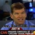 D。2006年尾,位于美国科罗拉多州(Colorado Springs)新生命教会(New Life Church)的创办人和主任牧师,也是全美福音派联盟(National Association of Evangelicals)主席的Ted Haggard牧师,竟然被揭发隐藏多年侵淫在同性恋的丑闻。有一个男性工作者公开爆出他和牧师有三年每月一次的商业“性交易”,后者在性行为中还吸食毒品(methamphetamine and poppers)。Ted Haggard牧师后来承认自己犯了性不道德的罪,并发表公开信说 “There is a part of my life that is so repulsive and dark that I’ve been warring against it all of my adult life.”(在生命中有非常可憎和黑暗的一部分,是他成年后一直存在的斗争。) 又说:“Then, because of pride, I began deceiving those I love the most because I didn’t want to hurt or disappoint them.”(人站的越高,就越容易受到骄傲的试探,为了保持一个正人君子的面目,就只好撒谎欺骗。)这个牧师肯定不确实地知道“无论是淫乱的,是污秽的,是有贪心的,在基督和上帝的国里都是无分的。”