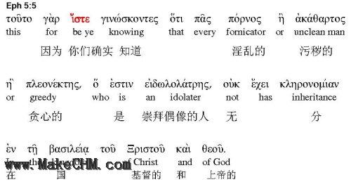 “因为你们确实地知道,无论是淫乱的,是污秽的,是有贪心的,在基督和上帝的国里都是无分的。有贪心的,就与拜偶像的一样。”-- 原文是:
