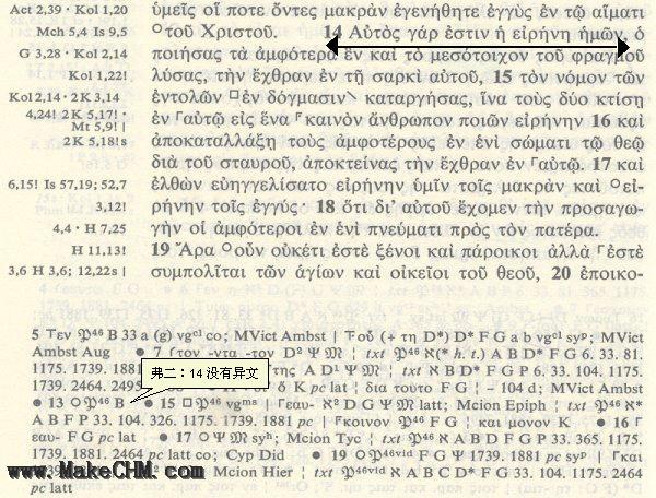 从希腊文圣经的评注版本(Nestle-Aland Novum Testamentum Graece 26th edition),我们看到弗二:14 节并没有异文(variant reading)- “异文”就是两种以上的经文抄卷或版本出现字词、句子、段落之间的差异记载。(看下图)