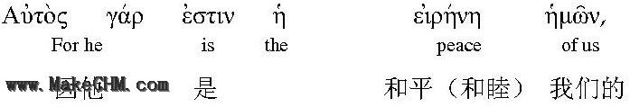 1。在上一课谈到弗二:14节“因他使我们和睦(注:原文作"因他是我们的和睦"),将两下合而为一,拆毁了中间隔断的墙。。”由于当时的重点是说“外邦人与犹太人(两下)和睦”,所以我没有解释这节的上半部有关中文翻译的问题。现在我们再看这一节: