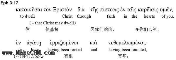 “我在父面前屈膝,(天上地上的各(注:或作"全")家,都是从他得名。)”-- 在原文,15节的片语“天上地上的各(注:或作"全")家,都是从他得名。”是紧跟在14节的“父”(father, 原文 patera)后面,告诉我们这一位“父”是谁。“各”家还是“全”家?原文是 pasa patria ,pasa 可以解作“各”,也可作“全”。在徒三:25 pasa patria 是作“万族”解。正如弗二:21,不管“各家”,还是“全家”,天上地上所有的“家”或“族”都是从万有的父那里得其名。