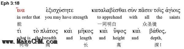 18节 -- 能以和众圣徒一同明白基督的爱(原文没有这个宾语,但加上去是合理的)是何等长阔高深