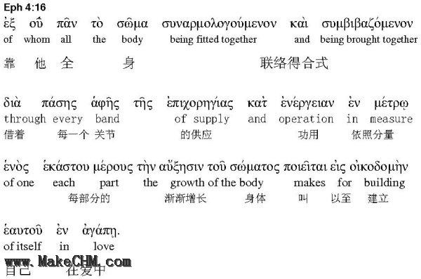 3。弗四:15 - 16 “15惟用爱心说诚实话,凡事长进,连于元首基督。16全身都靠他联络得合式,百节各按各职,照着各体的功用彼此相助,便叫身体渐渐增长,在爱中建立自己。”