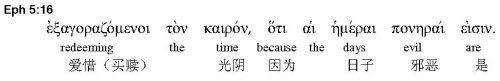 “爱惜光阴”- “爱惜”的原文 Exagorazo (加三:13,四:5)就是“买赎”(redeem),它和另一希腊字 apolutrosis 也就是以下经文里的“救赎”同义,不过在这节经文,“买”的观念比较重,“赎”的观念比较轻。