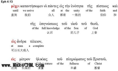 《新译本》:12为的是要装备圣徒,去承担圣工,建立基督的身体;13直到我们众人对上帝的儿子都有一致的信仰和认识,可以长大成人,达到基督丰盛长成的身量;