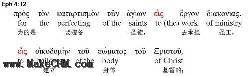 中文《和合本》和英文 KJV 的翻译(for..for ..for..)给人印象,上一节说的“他所赐的有使徒,有先知,有传福音的,有牧师和教师。”目的有三:一、成全圣徒;二、各尽其职;三、建立基督的身体。