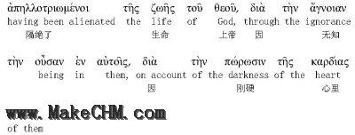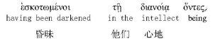 这里的“心地”,其实是上文“心”(nous)和另一个字的复合字。“心思昏昧”(having the understanding darkened)就等于我们平时说的“心眼瞎了”,当然是指灵性上的瞎眼。按文法来说,不是一时性的瞎眼,乃是持续性的。对于那些自以为不像“巴比龙”荒废了一生,在今生功名显达的人来说,他们就难逃这条罪状了。