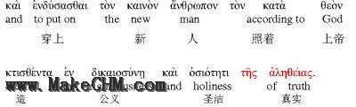 “这新人是照着上帝的形像造的,有真理的仁义和圣洁。”-- 《新译本》作“这新人是照着上帝的形像,在公义和真实的圣洁里创造的。”英文是:And that ye put on the new man, which after God is created in righteousness and true holiness。原文是: