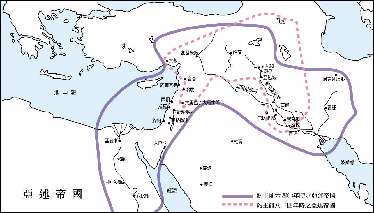 亚述(Assyria) 美索不达米亚北部,以底格里斯河为中心的地带,有好几个兴盛的时期。最重要的一个是在主前一○○○年至六一二年之间。亚述征服了整个近东,其法典(中亚述法典)和圣经律法有很多对应之处。