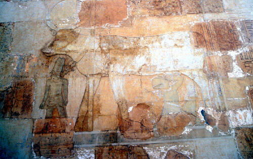 六十16 哺乳的比喻 埃及的国王常常在肖像绘画中被刻画为受众神所抚育。例如,有画作描写哈苏雪女王吸吮着女牛神哈妥尔的乳房。后者是女性、舞蹈、醉酒、性、死亡的神。她通常被描绘成有着牛角的女人。这个比喻意味着受到最好的照顾和注意。