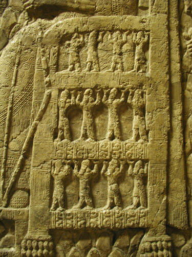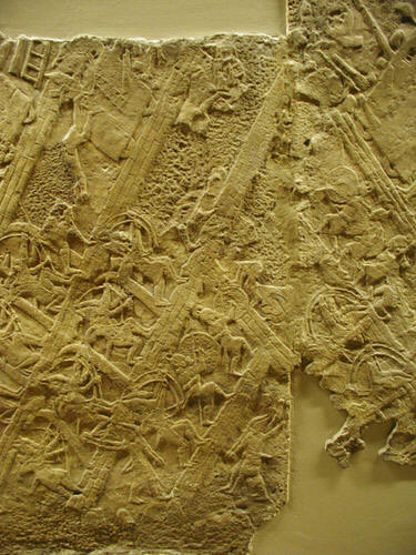 三十二9 围城战术 尼尼微城描绘拉吉之围的亚述浮雕,刻有撞城锤、七个攻城车、被掳的犹大人,以及坐在躺椅之上,旁观拉吉之战利品在面前搬过的西拿基立。这些画版强调亚述人是军事科技的专家。他们的军队编制极有条理,包括有弓箭手、标枪手、投石兵,以及管理攻城坡道和攻城车的士兵。攻城车是具有重型装甲的四轮车辆(较早期的设计则有六轮),前方装有长而尖的铁头杆子。车长十至二十呎,高四至六呎。车顶后面敞开,前面密封。西拿基立为这军事器械所增添的创新之处,包括裹以皮革。其他活动塔架的用处则是把弓箭手调至撞城锤旁以作掩护。除这浮雕以外,古代近东各处地方尚有很多壁画浮雕,描绘亚述的攻城战事。虽然如此,亚述人依然认为谈判是更上之策。例证可见于列王纪上十八至十九章。