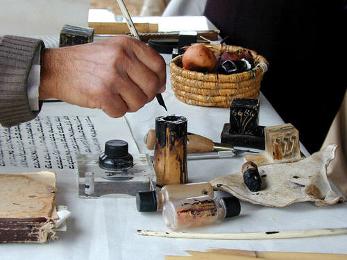 九2 墨盒子 古代一般文士所携带的墨盒子可以在写字时用作调色板,里面装着笔和盛墨的容器;墨通常有黑、红二色。本段中用来描述墨盒子的字眼所包括的埃及借词(qeset),证明它是某一种的调色板。这种板上有放笔的空档和两个装墨的凹陷处。无数埃及古墓壁画都有这种调色板。笔用灯心草或苇杆制成,削尖为可以按写字需要用作毛笔或尖笔。墨用碳和树胶调和制作。红墨则加上氧化铁制成,用来书写标题或绘制书卷上的线条。此外,写字工具还包括削笔的刀子(耶三十六23)。