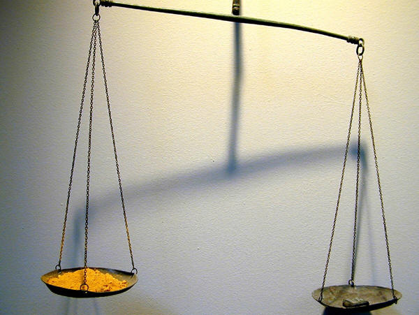 四十五10 公道天平 在没有标准度量衡的社会中,商人往往受诱惑在天平或量器上作弊。其方法往往是使用重量不对的法码,或借着假底等办法改变容器的分量。