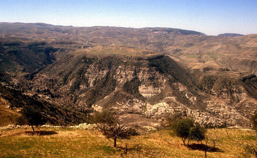 四十八8 山谷、平原和摩押地势 摩押高原自北而南大约有六十哩,其崎岖的边缘在西面毗邻死海,在西南面则与阿拉伯半岛接壤。它在此往西往东扩展十五哩,海拔高度大约三千呎。从东到西切过这高原的,是亚嫩河的支流莫吉布干河。其南界是黑萨干河(撒烈溪)的深峭峡谷。高原北面有一个伸出的地带,称为「米底巴台地」。这地方出入比较方便,因为它没有南面的深峭峡谷。